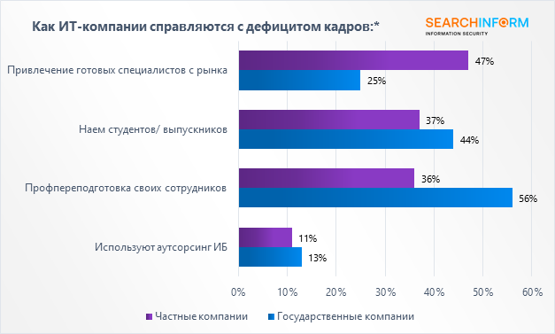 На рост инцидентов влияет не только низкий уровень знаний сотрудников или недостаточная оснащенность защитными средствами, но и нехватка квалифицированных кадров, которые могут работать со всеми этими направлениями. Компании по-прежнему испытывают дефицит ИБ-специалистов, 63% организаций считают, что он остается уровне 2021 и 2022 года, а 14% – что усилился. Наиболее привлекательным решением проблемы для частных компаний является привлечение готовых специалистов с рынка, почти половина используют этот подход. Для государственных – профессиональная переподготовка своих специалистов. 12% компаний используют аутсорсинг, ещё 10% планируют к ним присоединиться. Компании отмечают, что это поможет быстрее начать и повысить ИБ и снизить трудозатраты. Проблем с дефицитом кадров нет и не было у 16% ИТ-компаний, 8% считают, что он ослаб.
