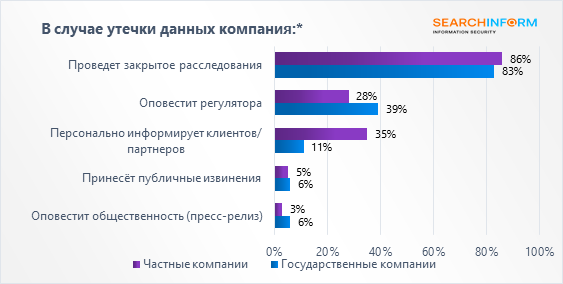При утечке данных большинство компаний проведет закрытое расследование, лишь четверть из них персонально информирует клиентов/партнеров/других лиц, а 9% – принесут публичные извинения или оповестят общественность через СМИ.