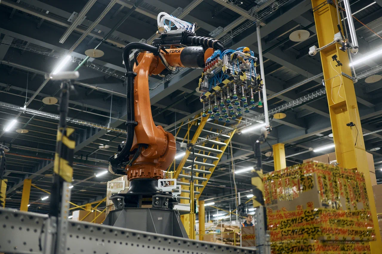 Сейчас Маркет тестирует Роборуку на суперскладе: она поднимает с конвейера коробки разных размеров, форм, веса и раскладывает на соответствующие палеты, и наоборот, – разбирает их. С Роборукой скорость сборки одной палеты в среднем увеличивается в два раза.
