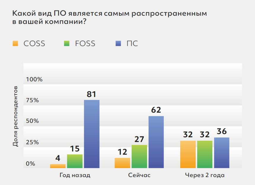 72% опрошенных компаний-вендоров ПО планируют запустить коммерческое ПО на открытом исходном коде в течение ближайшего года. Однако 68% респондентов -разработчиков считают проблему «фейковых» вендоров серьезно мешающей развитию рынка коммерческого open source рынка, а каждый пятый считает её «крайне серьезной». Часть интеграторов пользуется готовыми FOSS - решениями, не участвуя в их дальнейшей доработке: «фейковые» продукты не отражают актуальные изменения, что приводит к быстрому устареванию и накоплению неисправленных уязвимостей. Продажа FOSS - продуктов в брендированной обертке подрывает доверие к COSS - модели, так как фейковые вендоры не могут решать клиентские задачи, обеспечить своевременное обновление и серьезную техническую поддержку.