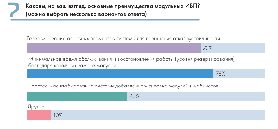 Возможности резервирования ИБП существенно повышаются при использовании модульных ИБП. Из тех компаний, которые применяют модульные ИБП (71% опрошенных), примерно три четверти задействуют преимущества резервирования модулей. Респонденты отметили также такие преимущества модульных ИБП, как минимальное время обслуживания/восстановления работы (уровня резервирования) и простое масштабирование системы добавлением силовых модулей и кабинетов.