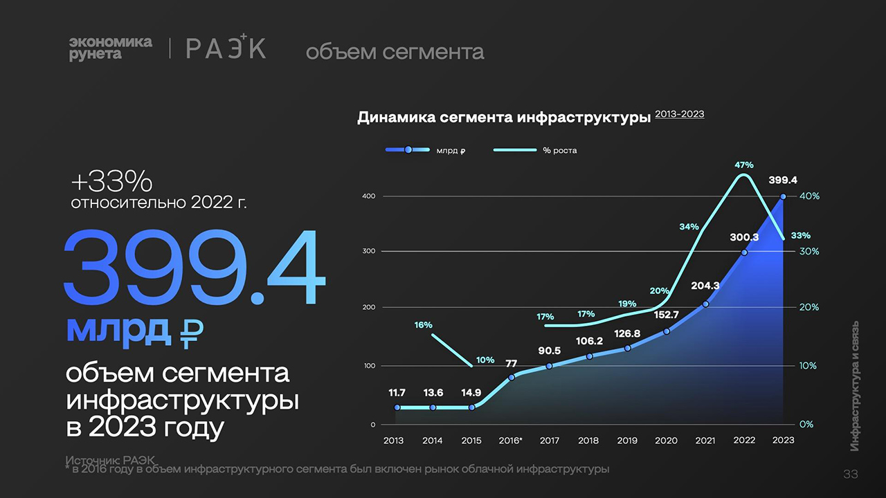 По данным исследования "Экономика Рунета", сегмент инфраструктуры в 2023 году увеличился в объемах до 399,4 млрд рублей, показав рост 33% относительно 2022 года. Сегмент составляют рынок облачной инфраструктуры (включая IaaS, PaaS, DBaaS, облачный хостинг, а также ЦОД), рынок SaaS (ПО как сервис), рынок хостинга и рынок доменов.