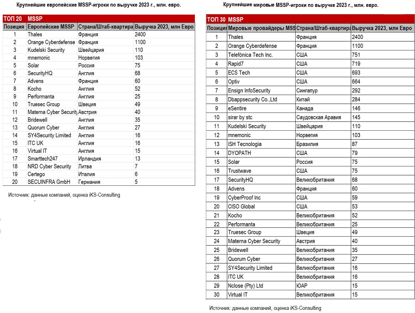 iKS-Consulting ранжировал крупнейших мировых игроков MSSP/SOC по выручке за 2023 г. В этом рейтинге российский Solar (ГК «Солар») расположился на пятом месте среди европейских провайдеров и на 15-м в мировом ТОПе. В 2023 году выручка Solar от услуг MSSP и SOC составила 75 млн. евро.