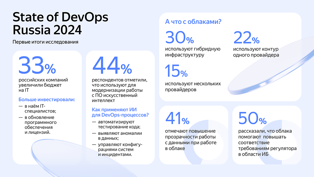 По данным исследования State of DevOps Russia, в 2023 году 33% российских компаний увеличили ИТ-бюджет. Больше всего бизнес инвестировал в найм IT-специалистов и обновление программного обеспечения и лицензий. Для оптимизации работы ПО и DevOps-процессов компании стали чаще применять технологии искусственного интеллекта — об этом рассказали 44% опрошенных.