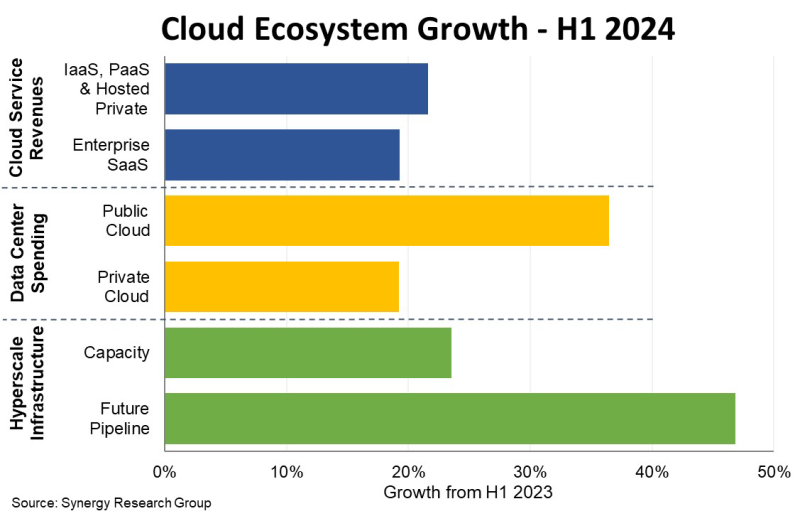 По данным Synergy Research Group, суммарные доходы операторов и поставщиков облачных услуг и инфраструктуры в I половине 2024 года достигли $427 млрд, увеличившись примерно на 23 % по сравнению с I полугодием 2023-го.