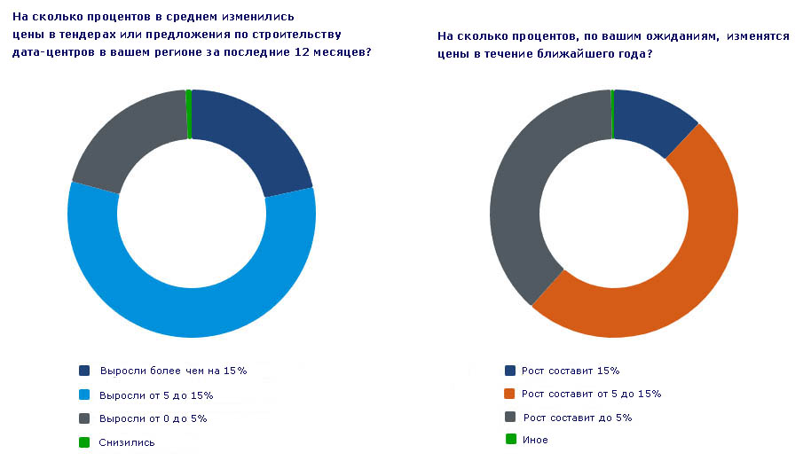 58% опрошенных в ходе исследования T&T, отвечая на вопрос "На сколько процентов в среднем изменились цены в тендерах или предложения по строительству дата-центров в вашем регионе за последние 12 месяцев?", сообщили о росте на 5–15%. Еще 21% отметили рост более чем на 15%.