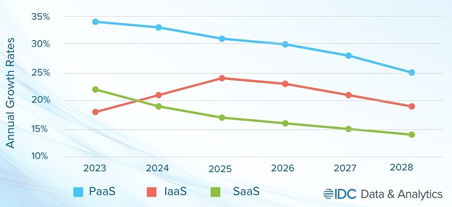 Однако из-за своего размера и зрелости эта категория растет медленнее остальных. Самым быстрорастущим сегментом в 2023-2028 гг. явится PaaS - его прогнозируемый среднегодовой рост составит 29,3%. На третьем месте - IaaS со среднегодовым темпом роста 21,6%.
