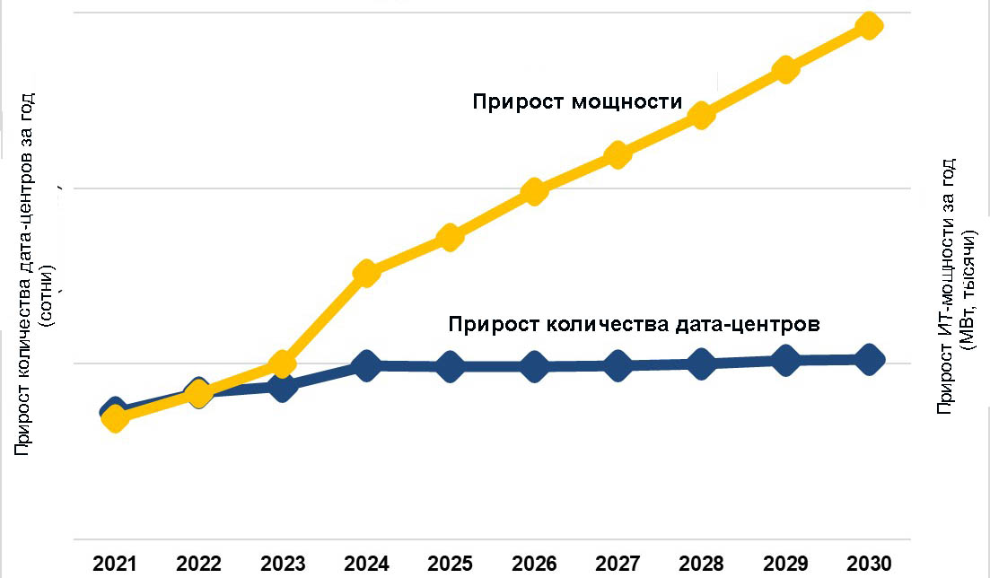 Кроме того, как отмечается в прогнозе, по мере увеличения средней ИТ-нагрузки отдельных дата-центров будет неуклонно расти общее количество действующих гипермасштабных ЦОДов. Существующие дата-центры также будут модернизироваться для повышения их мощности. В итоге общая емкость всех действующих гипермасштабных дата-центров к 2030 году вырастет почти втрое.