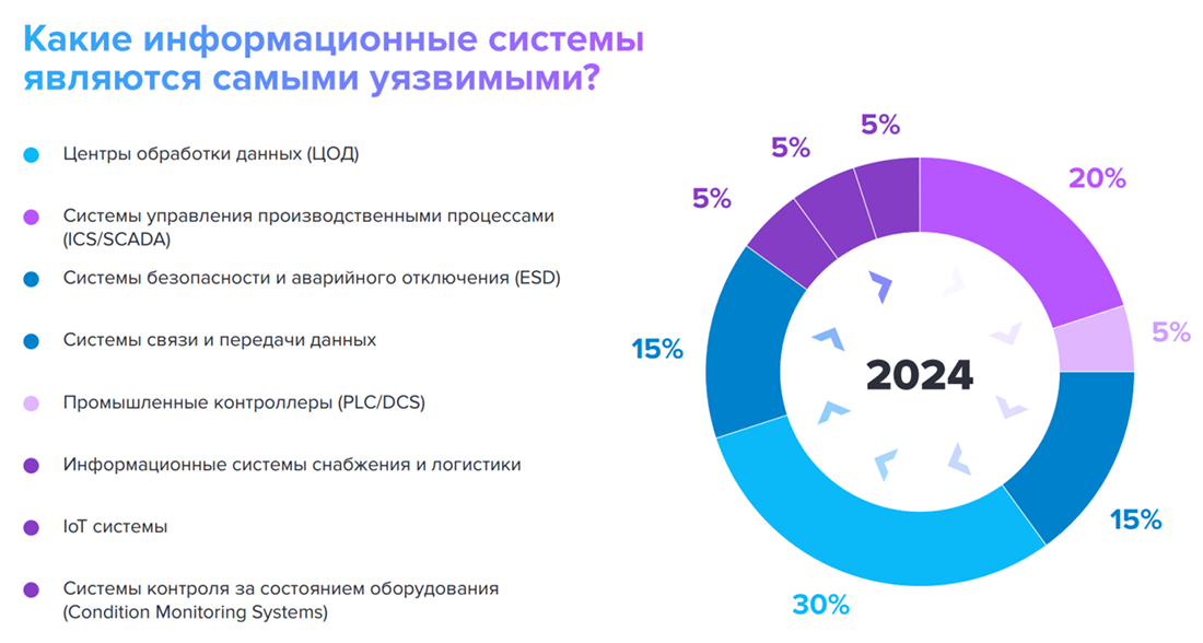 По мнению 30% опрошенных экспертов, больше всего в нефтегазовом секторе киберугрозам подвержены дата-центры. Также каждый пятый (20%) назвал системы управления производственными процессами (ICS/SCADA). Системы безопасности и аварийного отключения (ESD) и системы связи и передачи данных разделили третье место с одинаковым показателем в 15%. Промышленные контроллеры (PLC/DCS), информационные системы снабжения и логистики, IoT-системы и системы контроля за состоянием оборудования получили по 5% голосов.