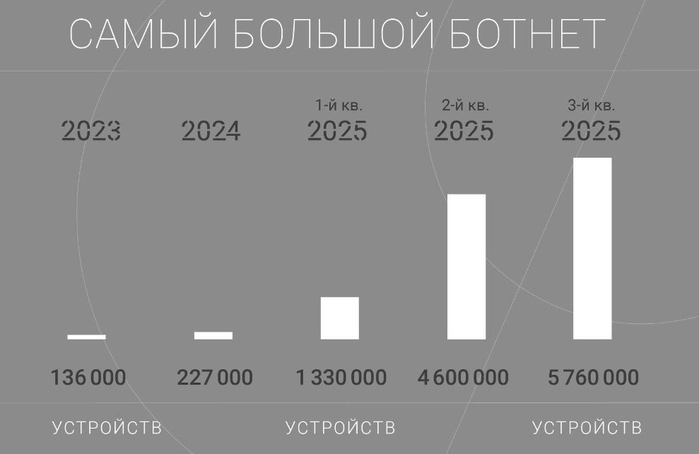В III квартале 2025 г. компания CURATOR зарегистрировала атаку, в которой участвовали 5,76 млн зараженных устройств. Большинство из них находились в Бразилии, Вьетнаме, США, Индии и Аргентине.