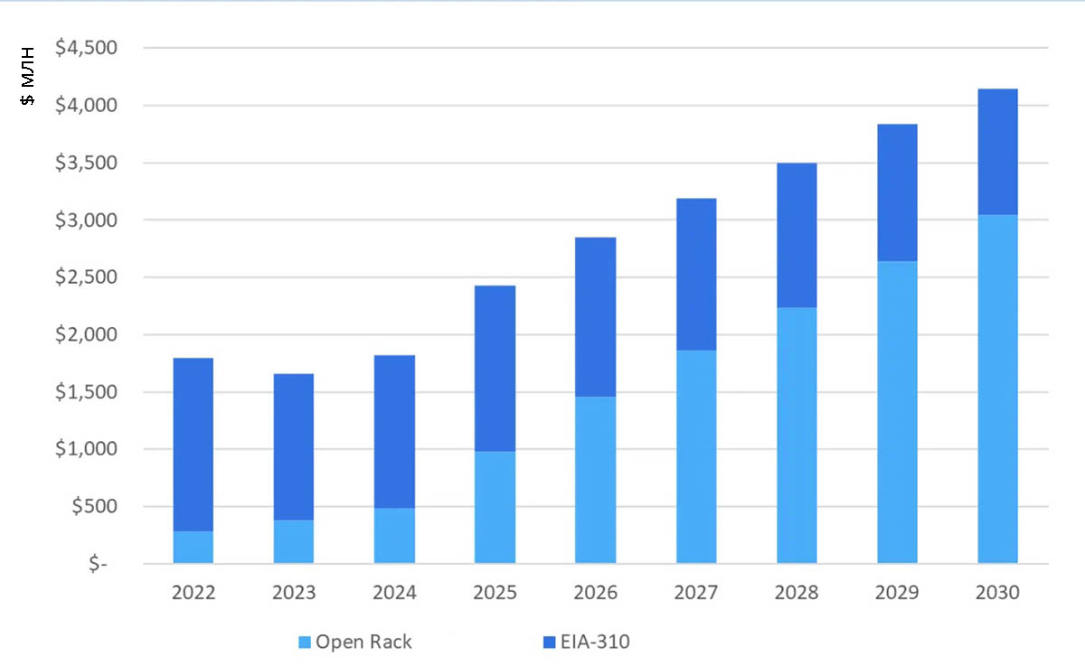 К 2030 году доля 21-дюймовых шкафов Open Rack в годовых поставках превысит 70%, поскольку операторы ЦОДов и основные производители серверов перейдут на эту конструкцию. 19-дюймовые шкафы EIA-310 будут устанавливать преимущественно предприятия, в первую очередь те, которые не используют ИИ-приложения.