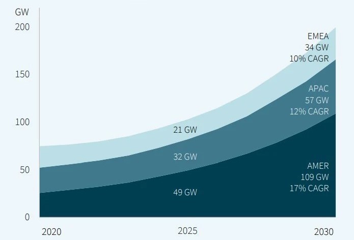 Прогноз энергопотребления ЦОДов по регионам, ГВт