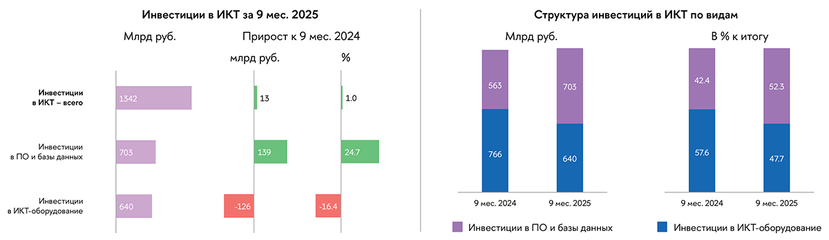 Как отмечают аналитики, сохранение положительной динамики обеспечил продолжающийся значительный рост вложений в ПО и базы данных (+24,7% к девяти месяцам 2024 г.) на фоне сокращения инвестиций в ИКТ-оборудование (-16,4%).