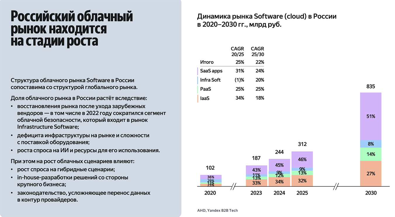 «Последние годы российский рынок ПО и облачных сервисов проходит ускоренную трансформацию: уход международных вендоров подпитывает ускоренный рост локальных разработчиков, прежде всего в инфраструктурных и платформенных сегментах. Параллельно растет спрос на облачные сервисы: компании ускоряют миграцию в облака, а провайдеры активно масштабируют IaaS, PaaS и SaaS. Рынок становится более фрагментированным, но остается динамичным», – комментирует Василий Пименов, руководитель программы исследований российского рынка Apple Hills Digital.